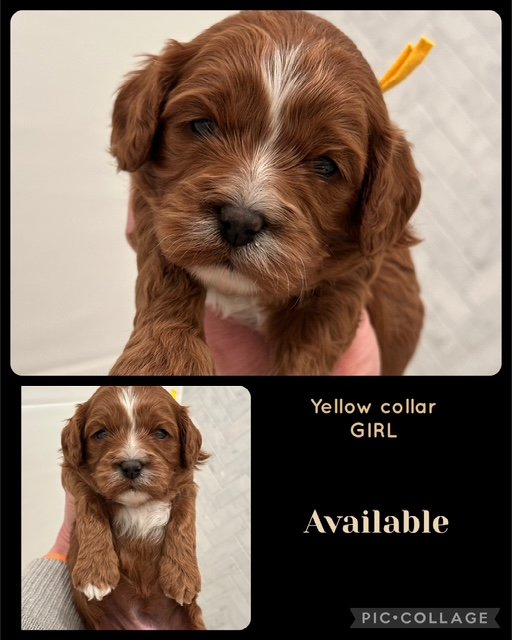 F1 Cavoodle puppy born 28 June 2025Gender: Female-"Yellow Collar Girl"Coat: Fleece CoatMum- Pure Cavalier King Charles Spaniel- weighs 8kg F1 Cavoodle puppy born 28 June 2025Gender: Female-"Yellow Collar Girl"Coat: Fleece CoatMum- Pure Cavalier King Charles Spaniel- weighs 8kg